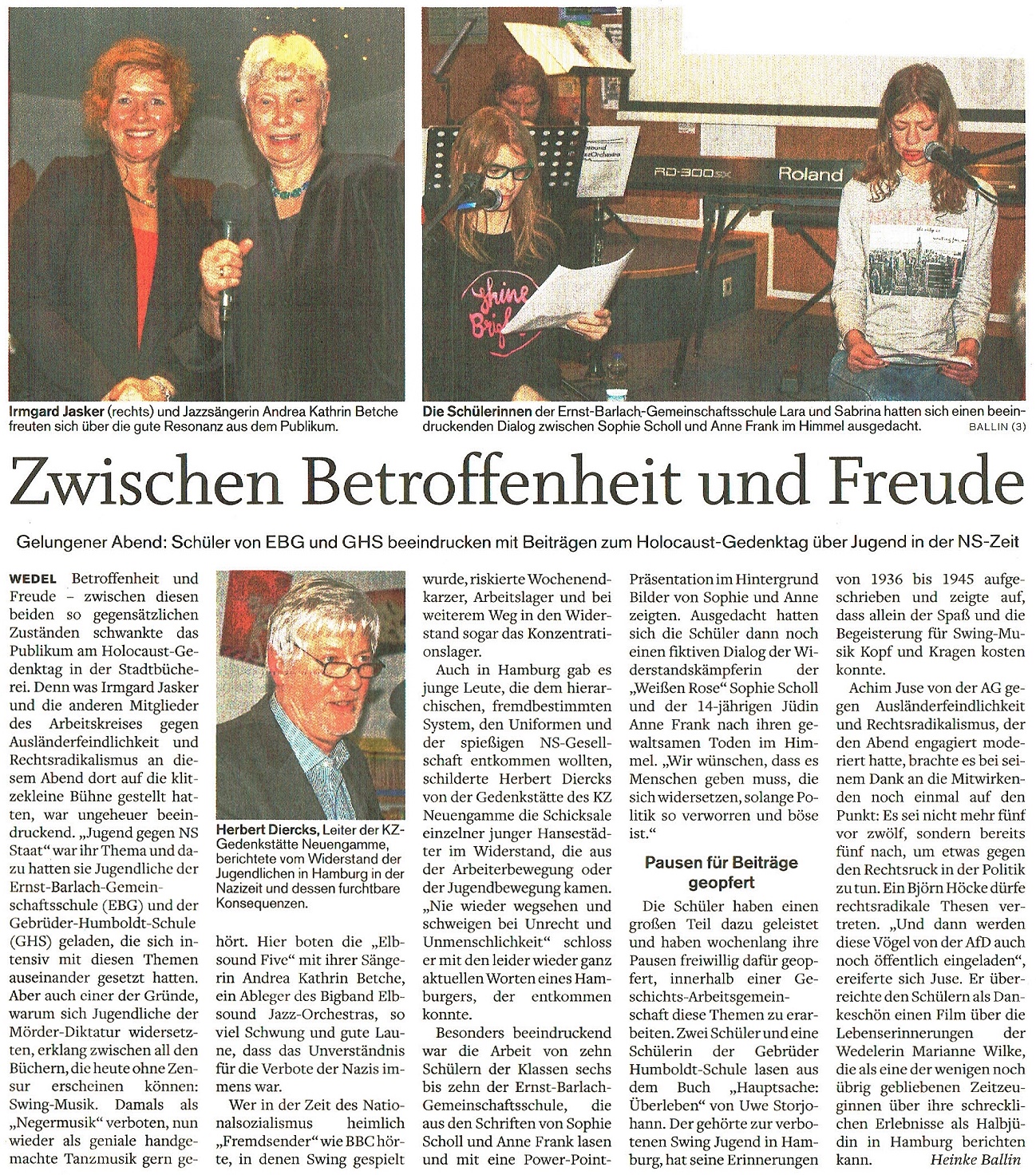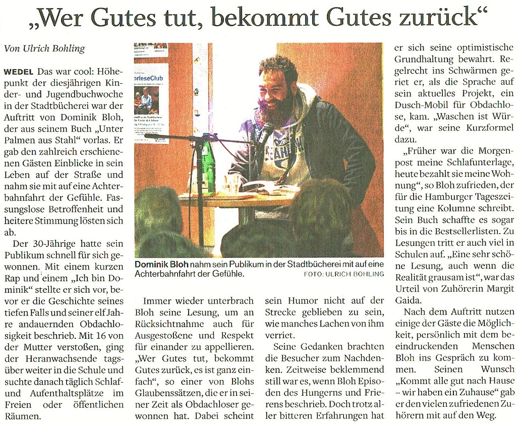Am Donnerstag (15.11.) gab es eine Abendveranstaltung. Dank des Einsatzes des Fördervereinsmitgliedes Ulrich Bohling berichtete Dominik Bloh von seinem Leben auf der Straße. Mit 16 Jahren wurde Bloh von seiner psychisch kranken Mutter vor die Tür gesetzt. Nun geht es in seinem Leben vorranging darum, Schlafplätze, Waschgelegenheiten und Lebensmittel zu finden. Dennoch schaffte er es, sein Abitur zu machen. In kalten Nächten deckte er sich damals mit der Hamburger MoPo zu, heute schreibt er für das Blatt.