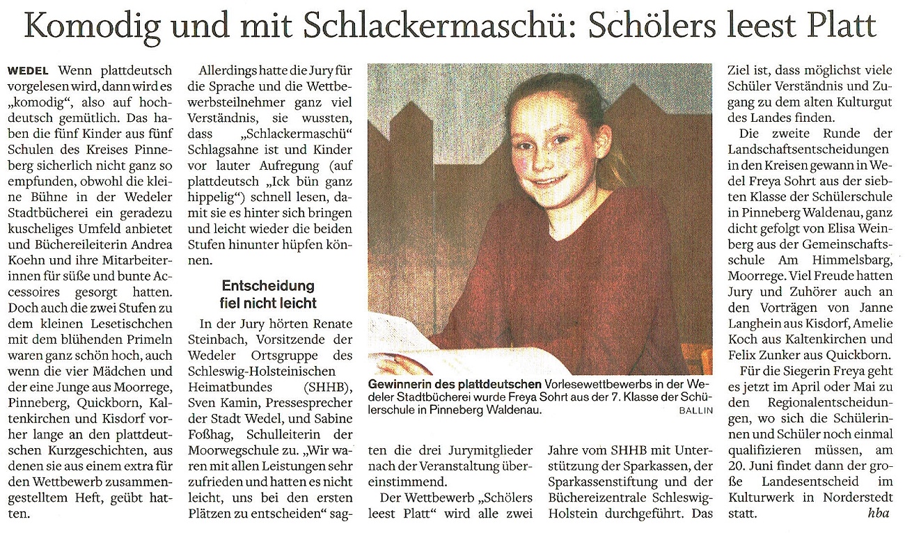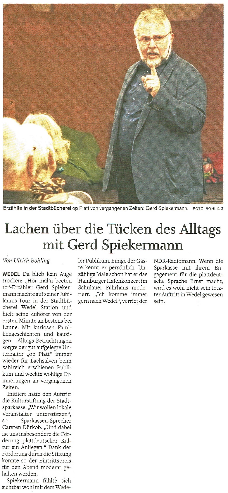Jeder platt-interessierte Radiohörer kennt "Hör mal’n beeten to" von "unserem" NDR. Der langjährigen Macher und "Schnacker" Gerd Spiekermann war auf Einladung von Stadtbücherei sowie mit freundlicher Unterstützung der Sparkasse Wedel zu einer Lesung in unsere Bücherei gekommen.