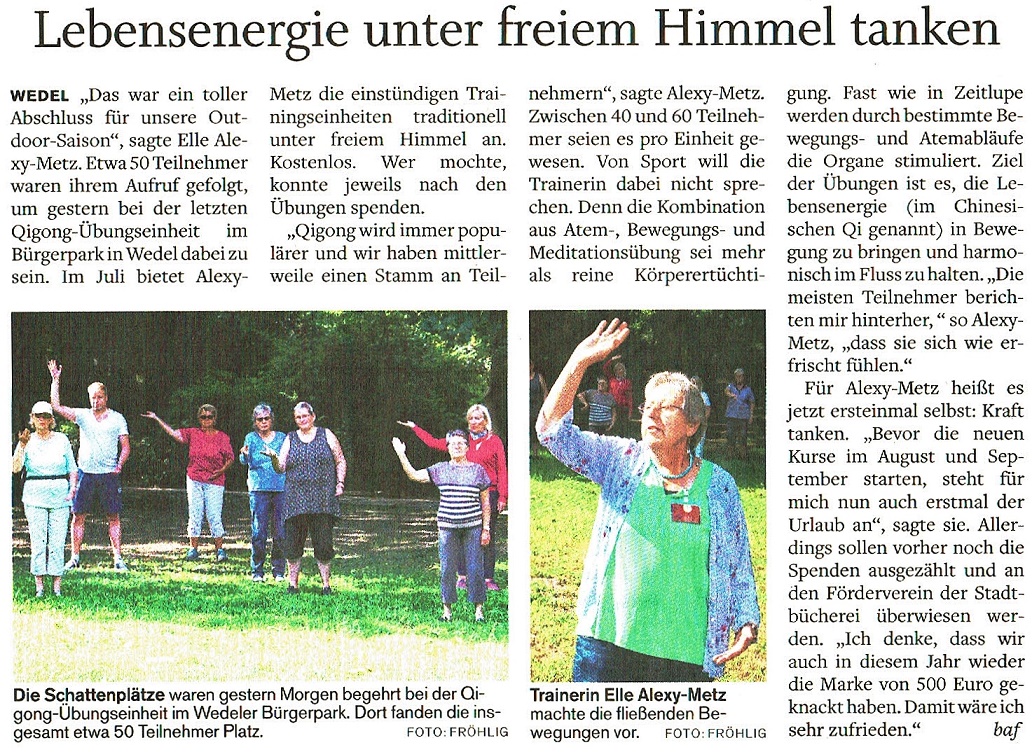 "Mens sana in corpore sano", wussten schon die alten Römer. Auch Qigong-Trainerin Elle Alexy-Metz stellte den Zusammenhang zwischen dem Training von Körper und Geist wieder einmal her. Sie sammelt während Ihrer Kurse im Bürgerpark Spenden ein. Nach Abschluss der Saison habe sie wohl wieder die Marke von 500 Euro geknackt. Ja, es waren sogar mehr als 700 Euro!, die Elle Alexy-Metz schlussendlich an Antje Alpers überreichen konnte.