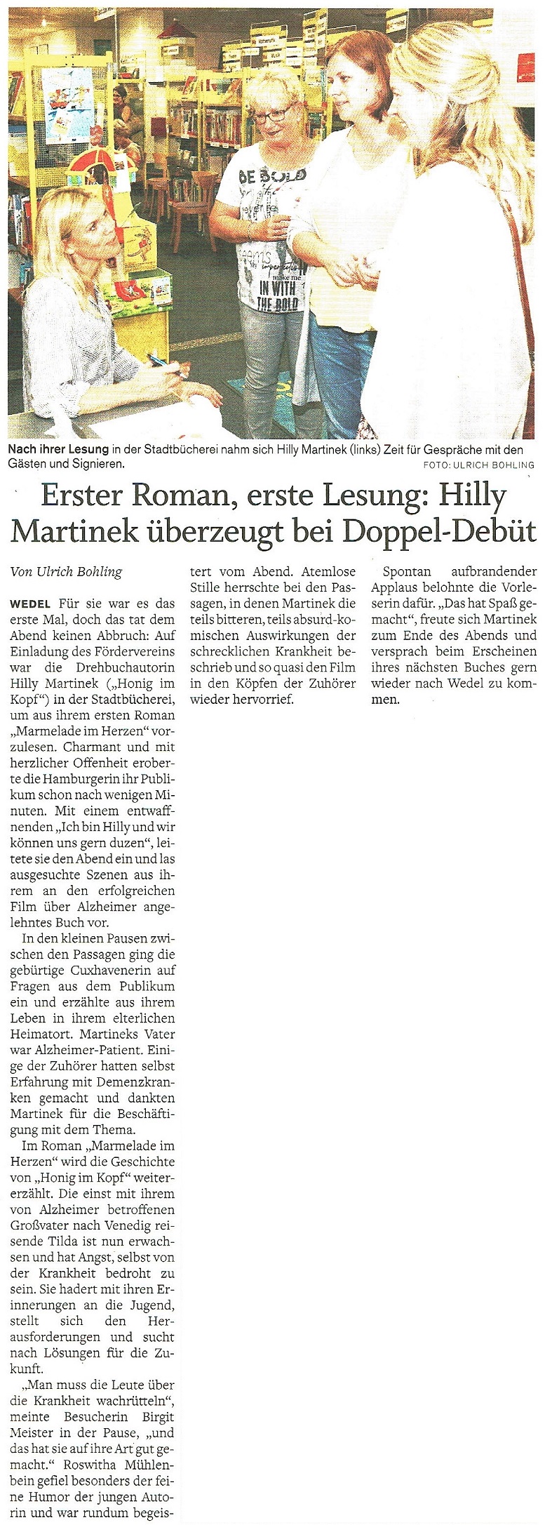 Die Lesung aus "Marmelade im Herzen" schlug ausnahmslos alle Anwesenden in Bann. Martinek erzählt in dem an das Drehbuch von "Honig im Kopf" angelehntes Buch die fiktive Geschichte einer jungen Frau mit an Alzheimer erkranktem Vater. Hierhin fanden auch autobiografische Erfahrungen der in der Nähe von Cuxhaven geborenen Künstlerin Eingang.