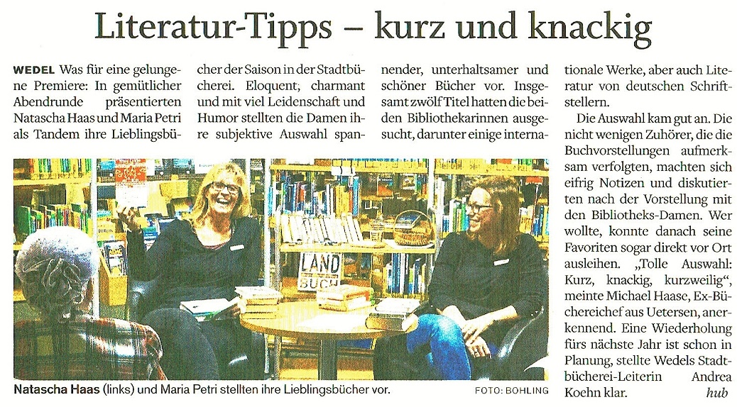 Zum ersten Mal haben sich am 8. November beide vor ein über 20-köpfiges Publikum begeben und jeweils sechs Lieblings-Bücher vorgestellt. Dabei war Nachdenkliches, Lustiges, Spannendes - Fiktives und Dokumentarisches - Spannendes und Lehrreiches.