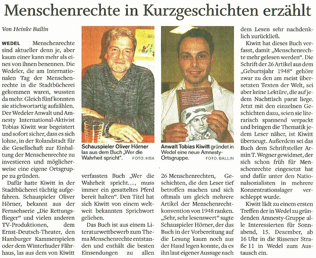 In Wedel wird von Rechtsanwalt Tobias Kiwitt derzeit eine Ortsgruppe von Amnesty International gegründet. Er hat anlässlich des 70. Jahrestages der Verkündung der Allgemeinen Erklärung der Menschenrechte den bekannten Schauspieler Oliver Hörner (Die Rettungsflieger) eingeladen.